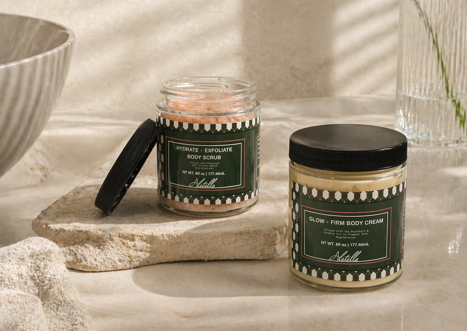 ALSTELLEThe Glow Ritual is a two-step body treatment — the Hydrate + Exfoliate Salt Body Scrub, followed by the Glow + Firm Body Butter. The scrub works through Himalayan salt and rosehip oil, clearing and resurfacing while the rosehip’s antioxidants support texture and tone; the butter follows with sea buckthorn and vitamin E, settling into skin while it’s still warm from the shower. The whole thing takes ten minutes, and your skin comes out noticeably smooth and luminous, like you spent the afternoon at a five-star spa.