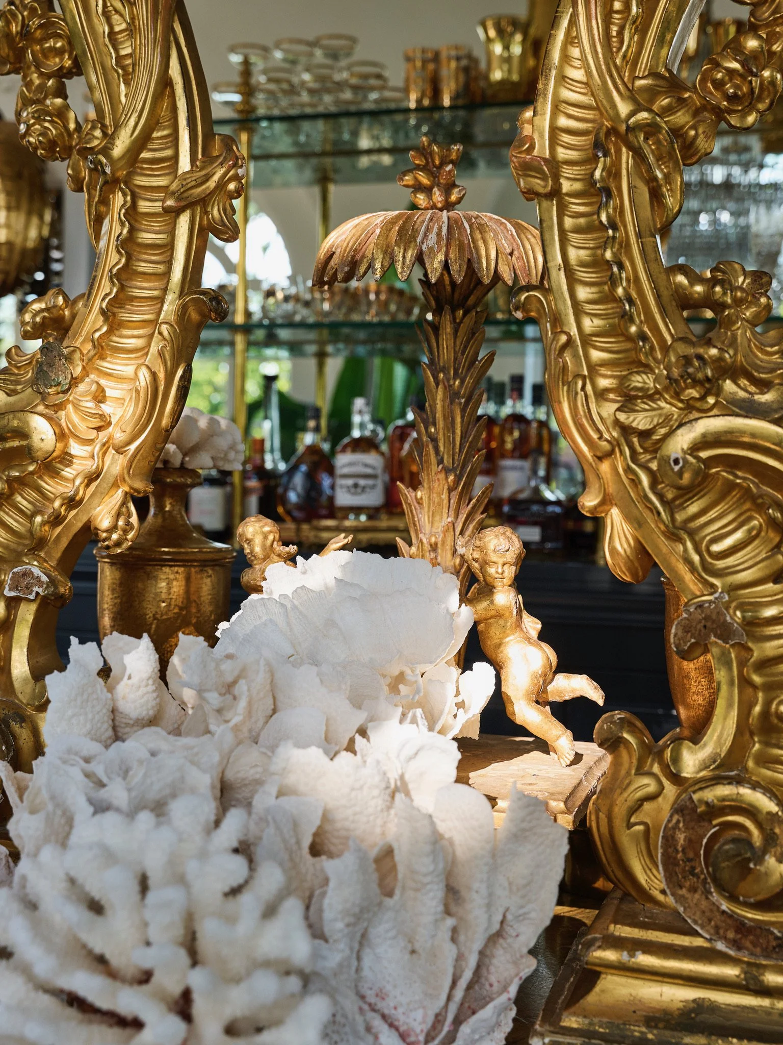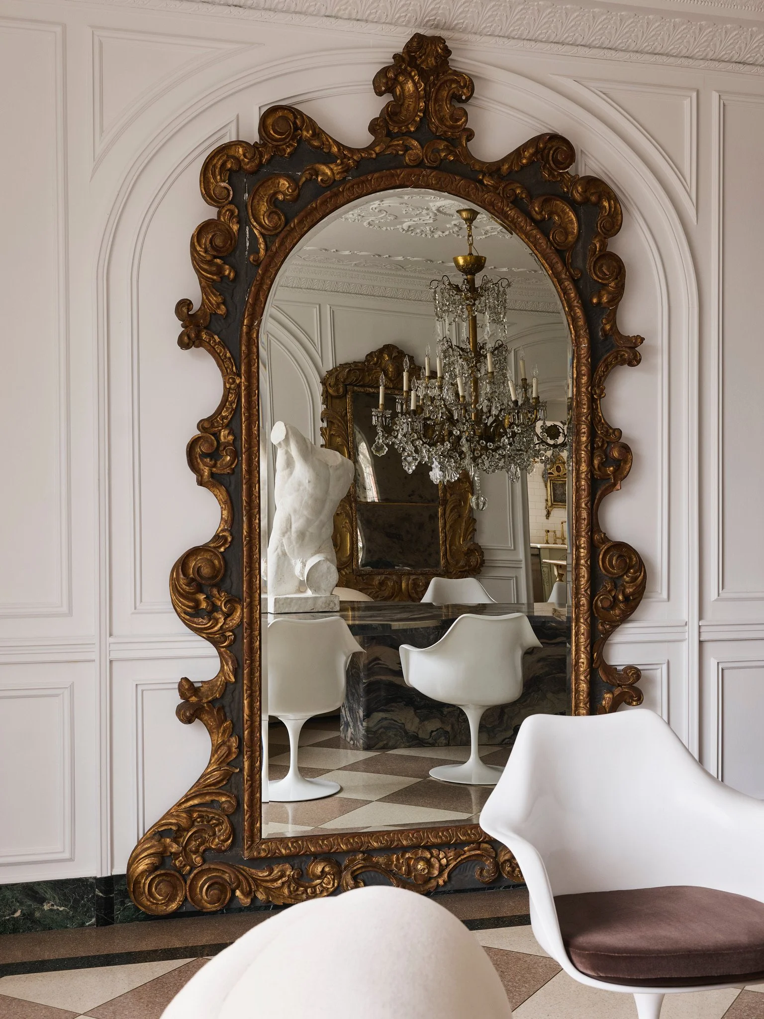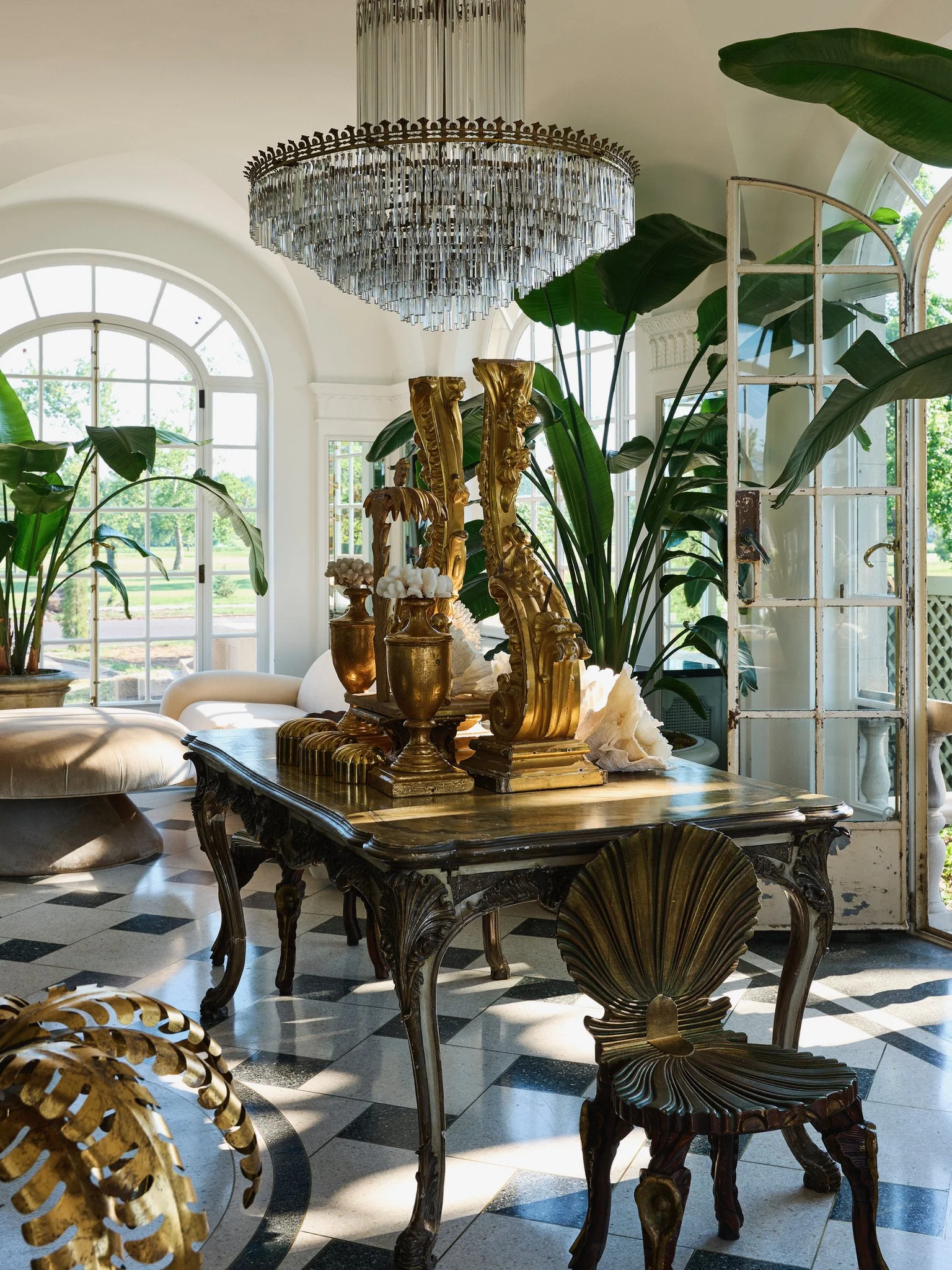 Her sourcing process follows instinct rather than lists. She allows the right pieces to find her. She gravitates toward bold scale. Mirrors that command a wall. Chandeliers that anchor a ceiling. Tables that hold a room with authority. When the architecture can carry it, she follows that energy.