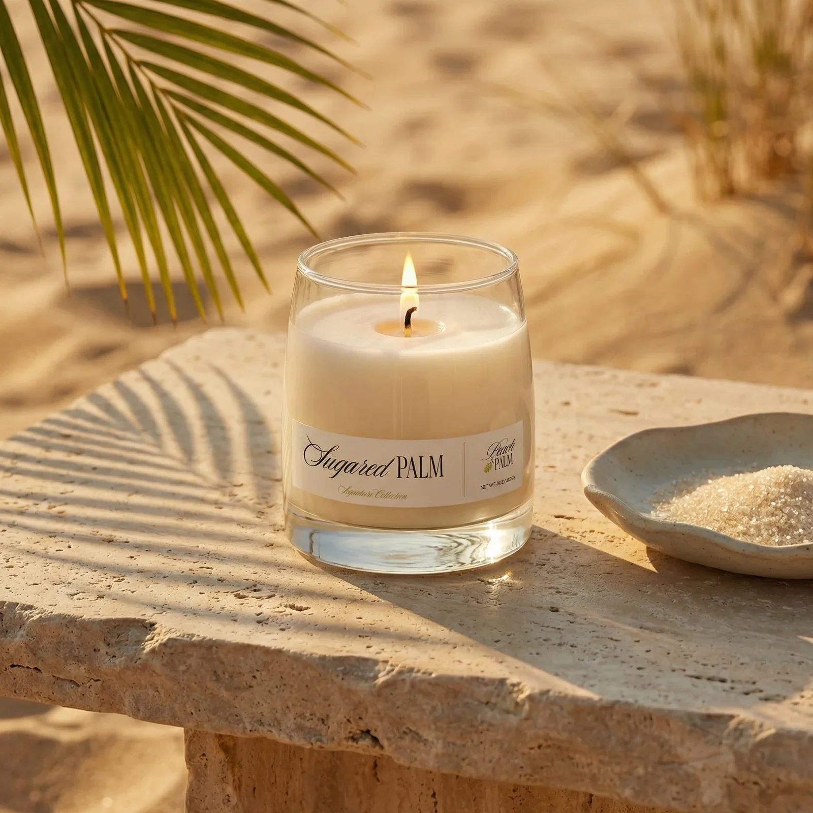 Peach & PalmSugared Palm draws on the warmth of late afternoon light, where sweetness settles into the air without excess. The composition blends airy notes with a soft, sun-warmed depth, creating a fragrance that feels both familiar and refined. It evokes the impression of skin touched by salt and heat, balanced by a subtle sweetness that lingers without becoming heavy.