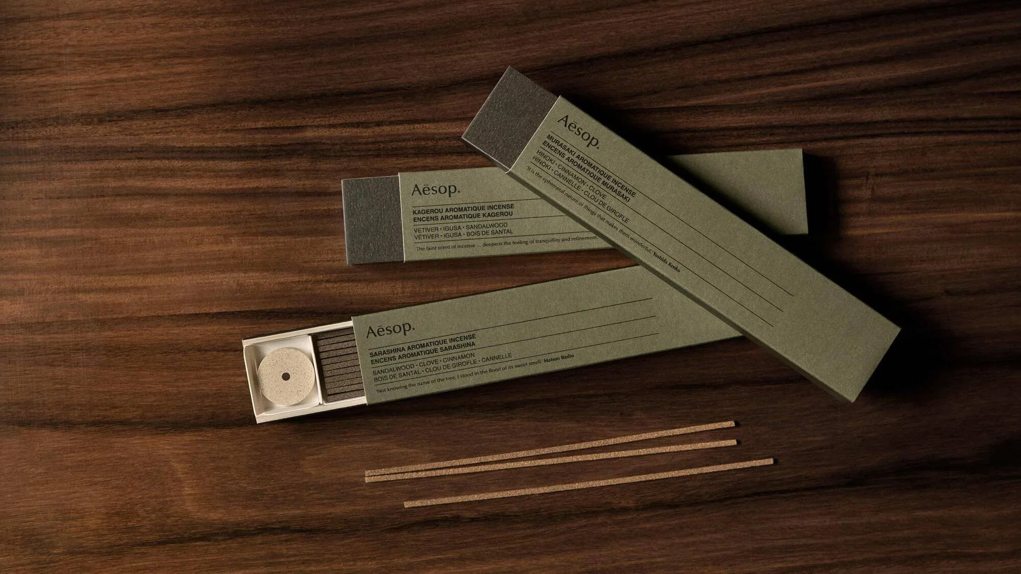 Aesop’s incense introduces a slower, more immersive approach to home fragrance, one that unfolds through time and movement. Blends such as Murasaki, Kagerou, and Sarashina offer compositions rooted in woods, resins, and subtle spice, producing a fragrance that deepens as it disperses. The smoke carries the scent through the room in layers, adding dimension rather than intensity.
