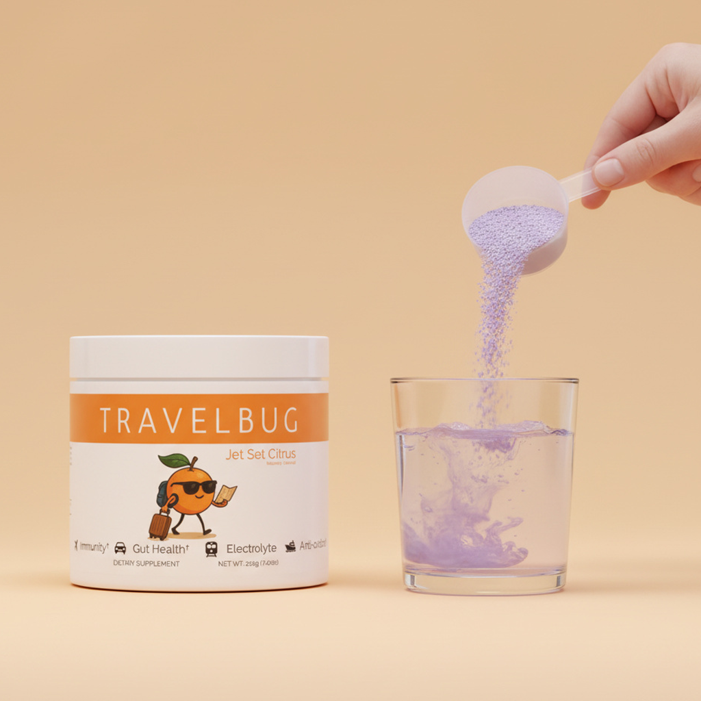 Airports at dawn, crowded terminals, school mornings that begin before the sun is fully up. Travel has a way of putting the body under pressure. TravelBug is research-driven immune support designed for life in motion. The powdered formula includes nutrients and botanicals associated with resilience and recovery. The proprietary blend brings together clinically dosed ingredients such as vitamin C, vitamin D, zinc, elderberry, and L-lysine, alongside electrolyte minerals and vitamins that optimize immune function. With that kind of nutritional support in place, the benefits extend beyond immunity alone, supporting the overall vitality that sits behind a healthy glow.